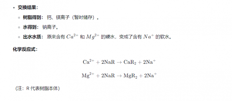 过程:水流经树脂,水中的钙镁被吸附,钠离子释放到水中。